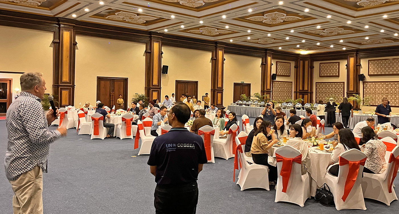 Anders Poulsen, Senior Project Manager of the UNEP/UNOPS/COBSEA SCSSAP Project (left) and Mahesh Pradhan, COBSEA Coordinator, kick off the weeklong gathering of representatives from the nine COBSEA countries, members of the Working Group on Marine and Coastal Ecosystems, and experts in a welcome dinner.