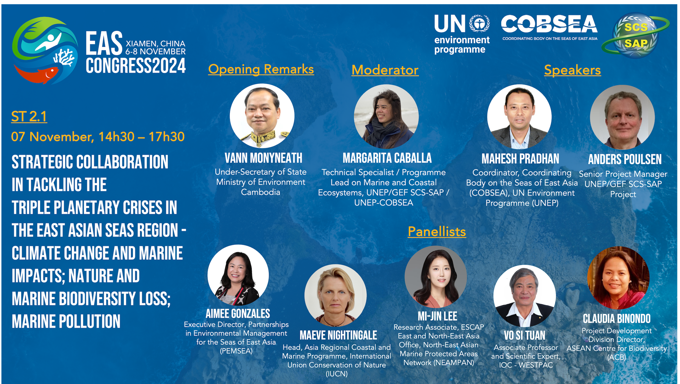 The SCS SAP Project and the UNEP Coordinating Body on the Seas of East Asia (COBSEA) will convene a session on "Strategic Collaboration in Tackling the Triple Planetary Crises in the East Asian Seas Region: Climate Change and Marine Impacts; Nature and Marine Biodiversity Loss; Marine Pollution" on 7 November 2024 at the PEMSEA EAS Congress 2024 in Xiamen, China. The session objective is to encourage collaborative efforts amongst regional marine organizations in the East Asian Seas to address the triple planetary crises.